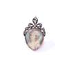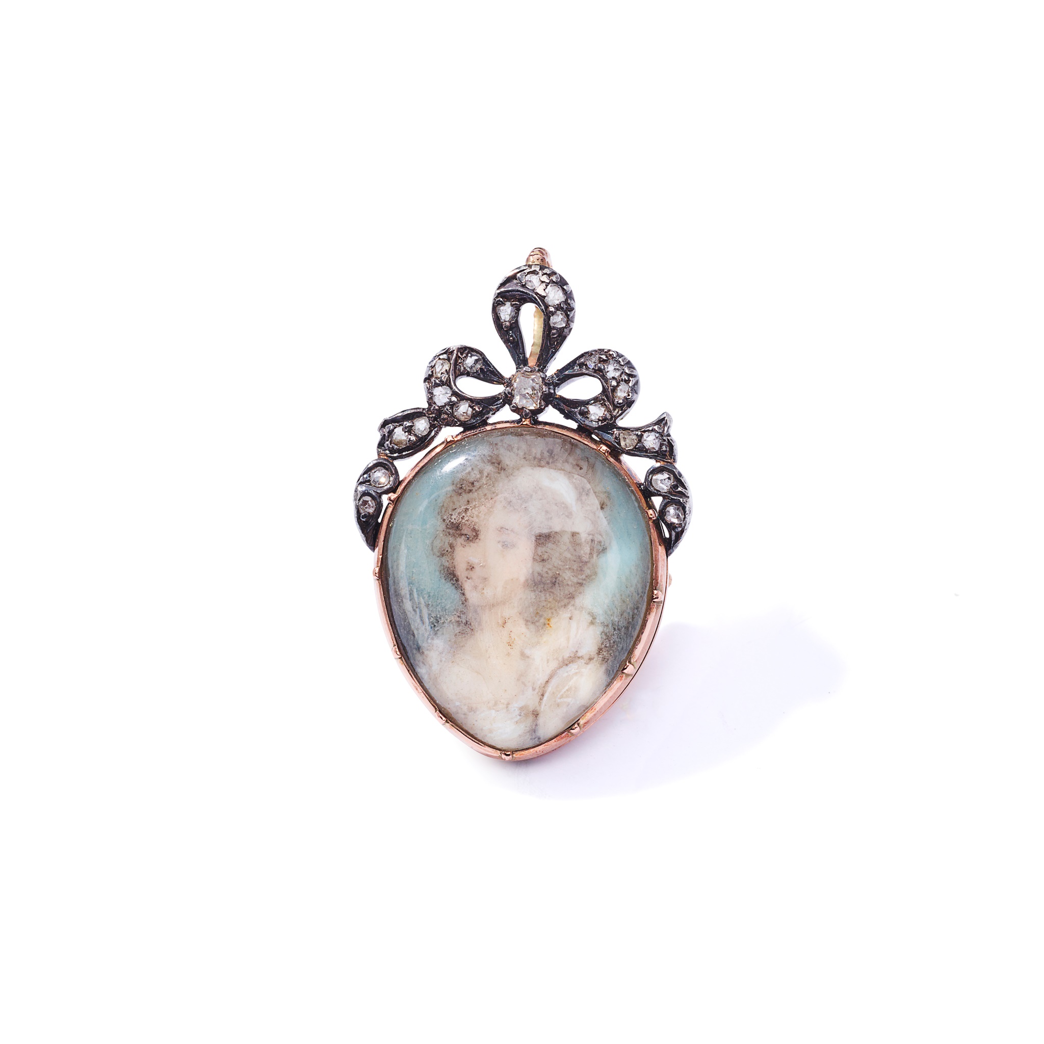 The pear-shaped glazed locket containing a portrait of a lady wearing a white dress, to a ribbon scroll surmount set with rose-cut diamonds