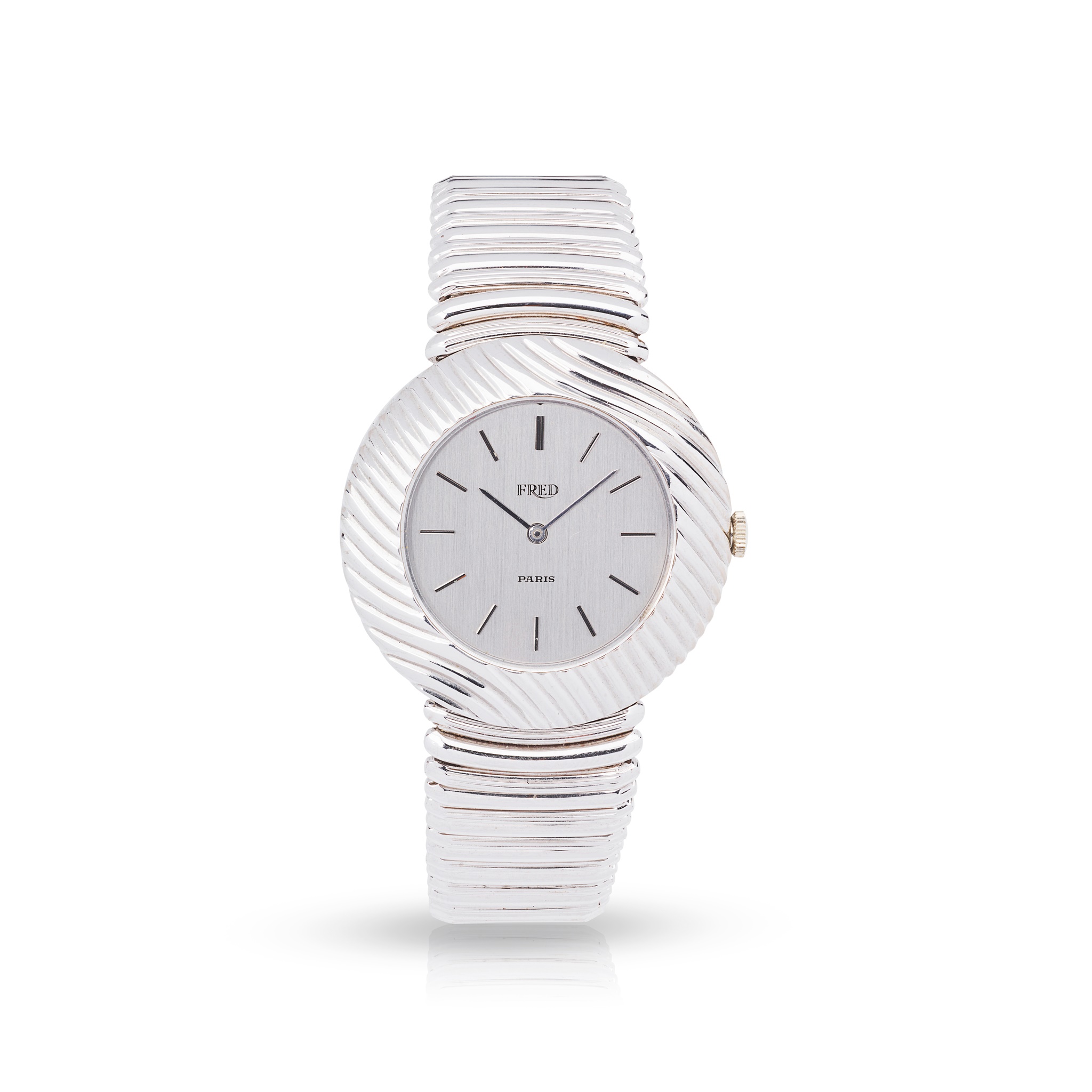 18ct white gold case with French and Swiss assay marks, signed round silver-coloured dial with applied baton hour markers, pencil hands, bezel with texture formed by concentric curved sections, the case back with 'by Gerald Genta,' and 1640, on an integrated bracelet strap formed by curved cylindrical bars, with a foldover clasp marked 750, with Italian marks, no box and papers