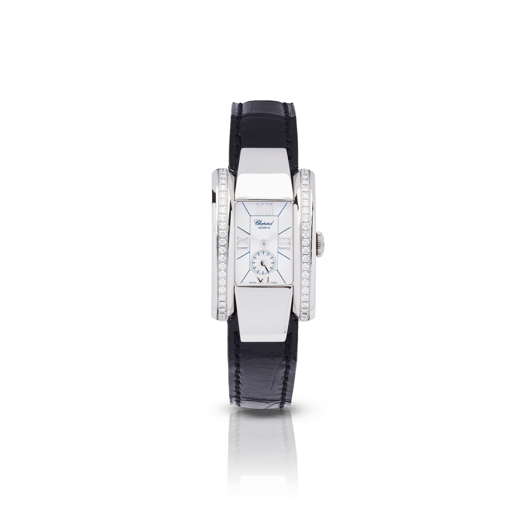 La Strada model 8357, stainless steel case, quartz movement, rectangular white dial with applied Roman 12, 3, 6 and 9 and baton hour markers, with a row of diamonds to each vertical case edge, with model and serial number to the caseback, on a signed Chopard strap with a signed Chopard deployant clasp, in box, with outer box, with papers