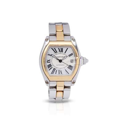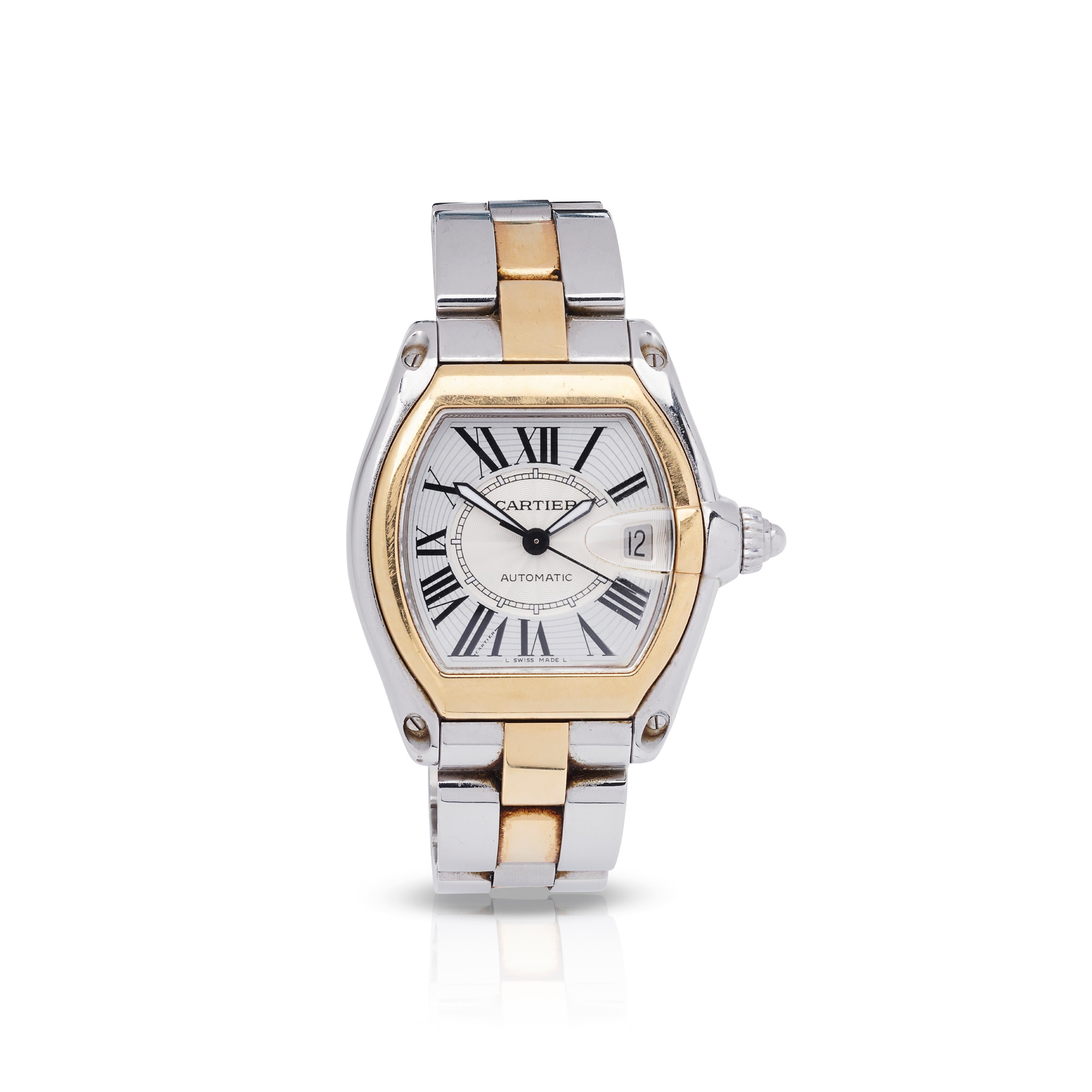 Roadster model 2510, bi-colour case, automatic movement, originally purchased 2007, the rounded square dial with Roman numerals in black, date aperture at 3, black sword hands with white inserts, centre seconds hand in black, railroad inner seconds track in black, on a stainless steel bi-colour bracelet strap with signed Cartier concealed clasp, in box, with papers