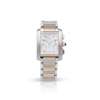 Tank Francaise Chronoflex model, stainless steel case, quartz movement, rectangular white dial, Roman numerals in black, sunken subsidiary dials at 12, 4 and 7 for date, 30 minute register and 12 hour register respectively, octagonal outer seconds track in black, blued steel pencil hands, centre seconds hand, octagonal crown set with a blue cabochon gem and flanked by twin rectangular push buttons, on a stainless steel and gold bracelet strap with concealed clasp, with instruction booklet, no box and papers
