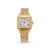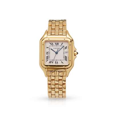 Panthere model, 18ct gold case, quartz movement, rounded square buff dial with Roman numerals in black, date aperture at 3, inner railroad seconds track in black, bezel with screwhead motifs, octagonal crown set with cabochon blue gem, the caseback numbered 8839680545, on an 18ct gold brick link bracelet strap with signed concealed clasp, European Convention marks, in box, with outer box, with papers. Amendment: please note this watch does not come with papers as previously stated.
