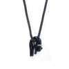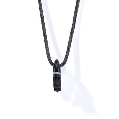 The carved black panther with applied diamond collar, suspended from a woven link steel necklace, French assay marks, maker's mark