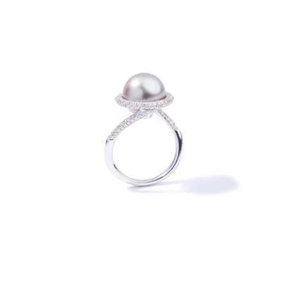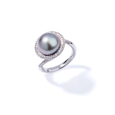 The 11.7mm grey cultured pearl, within a pavé-set brilliant-cut diamond crossover mount