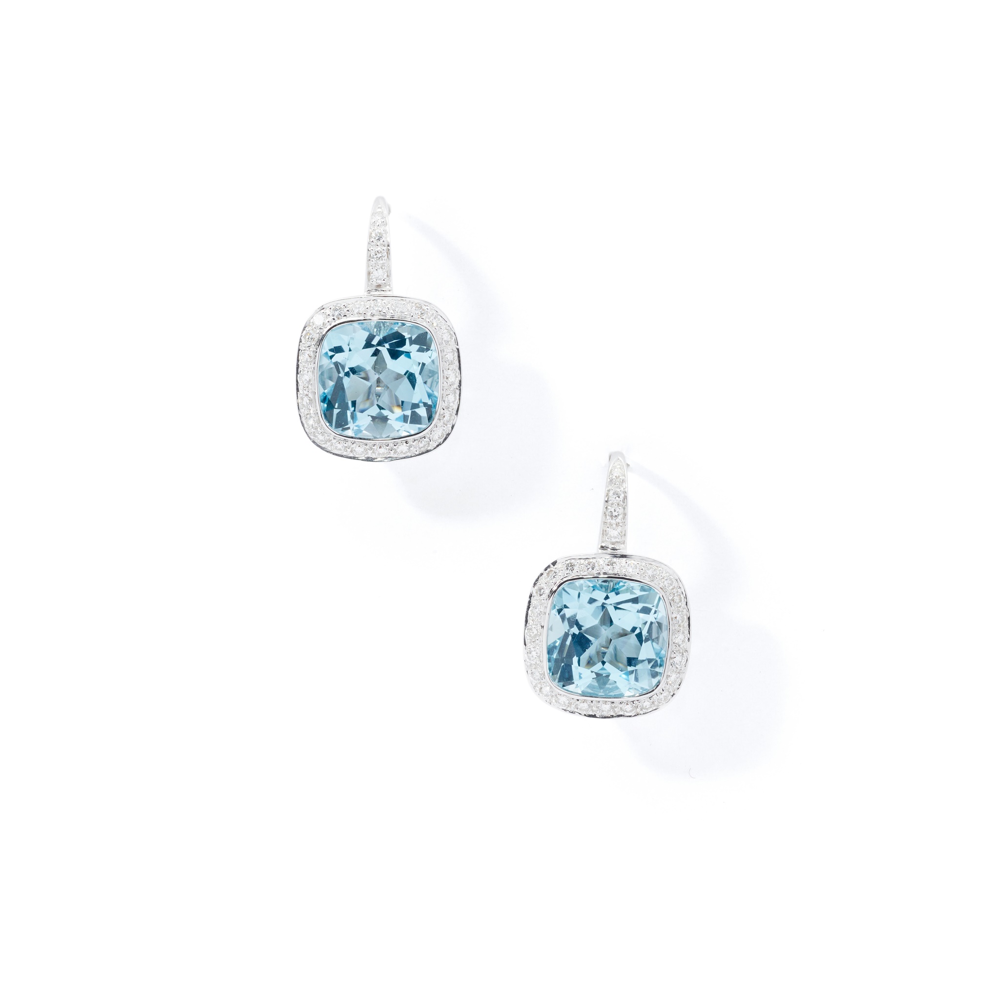 Each cushion-shaped blue topaz within a brilliant-cut diamond surround and surmount, mounted in 18ct white gold, hook fittings, signed Boodles, numbered, maker's mark, UK hallmark, maker's case