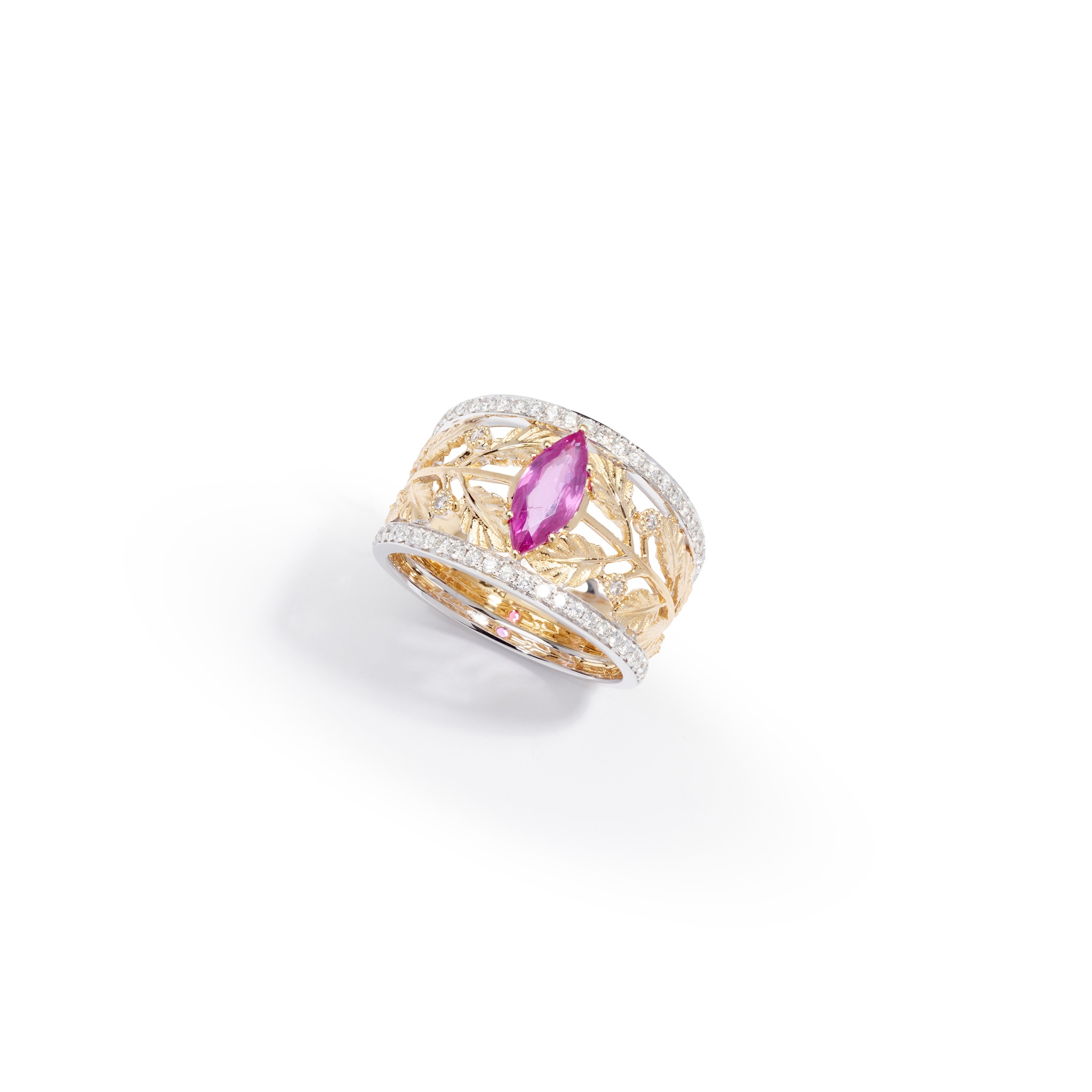 The navette-shaped pink sapphire between bi-coloured openwork foliate shoulders, to brilliant-cut diamond borders