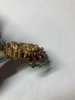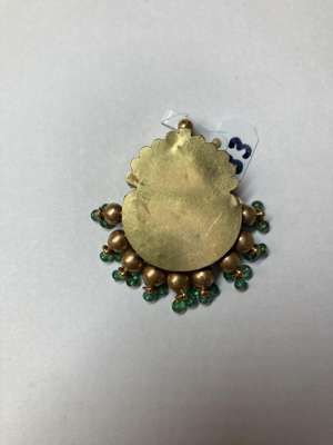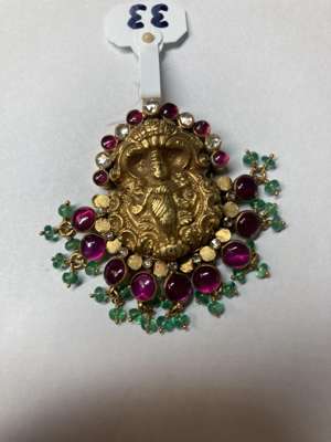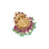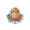 Modelled as an 18ct gold Hindu deity, surmounted by and suspending a line of cabochon rubies and rose-cut diamonds, to an emerald bead tassel fringe, UK hallmark