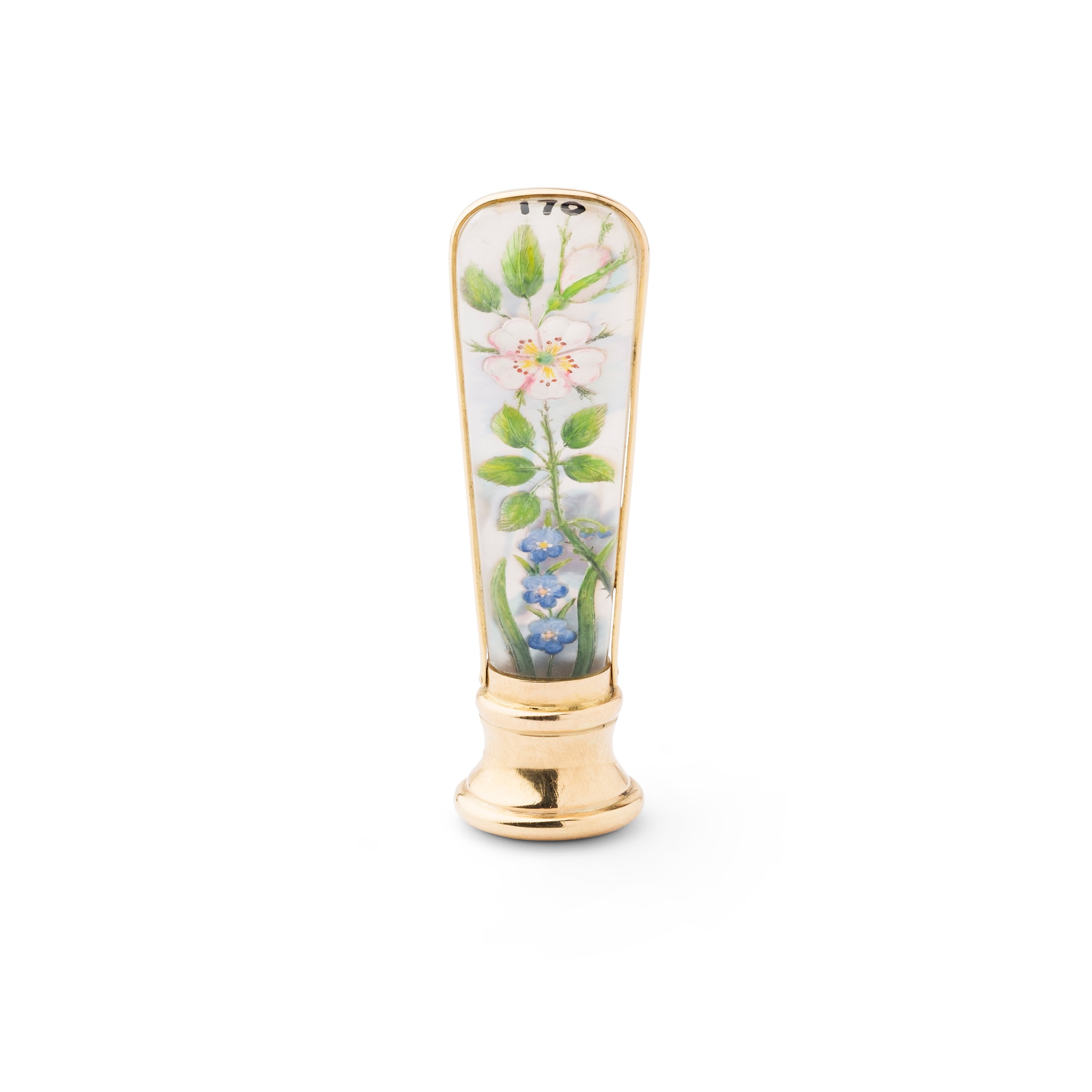 The tapered handle formed of two reverse painted panels decorated with wild flowers, including wild rose, speedwell, mallow and violet, backed onto mother-of-pearl, the socket mount set with oval hardstone intaglio after the antique engraved with cupid and a faun, in fitted read leather case by J Auner, Wein