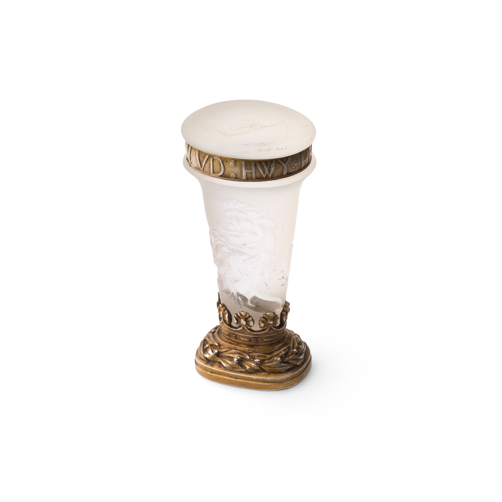 The baluster rock crystal handle with an engraved lion rampant, the domed terminal engraved 'fecit Cecil Thomas 1914' the silver-gilt mount to the neck with embossed Roman lettering 'HWY PERI CLOD NA GOLUD', the mount to the terminal modelled as a stylised coronet, above a laurel wreath, to a canted rock crystal matrix with engraved coat of arms