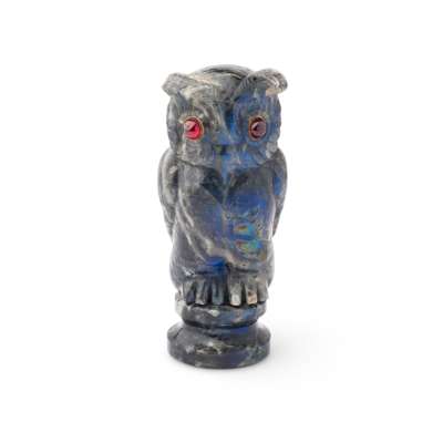 The carved labradorite owl with cabochon garnet eyes in gold collet mounts, the owl resting on a labradorite socle base which forms the matrix, engraved with coat of arms within laurel garland suspending Grand Cross of the Order of the Bath