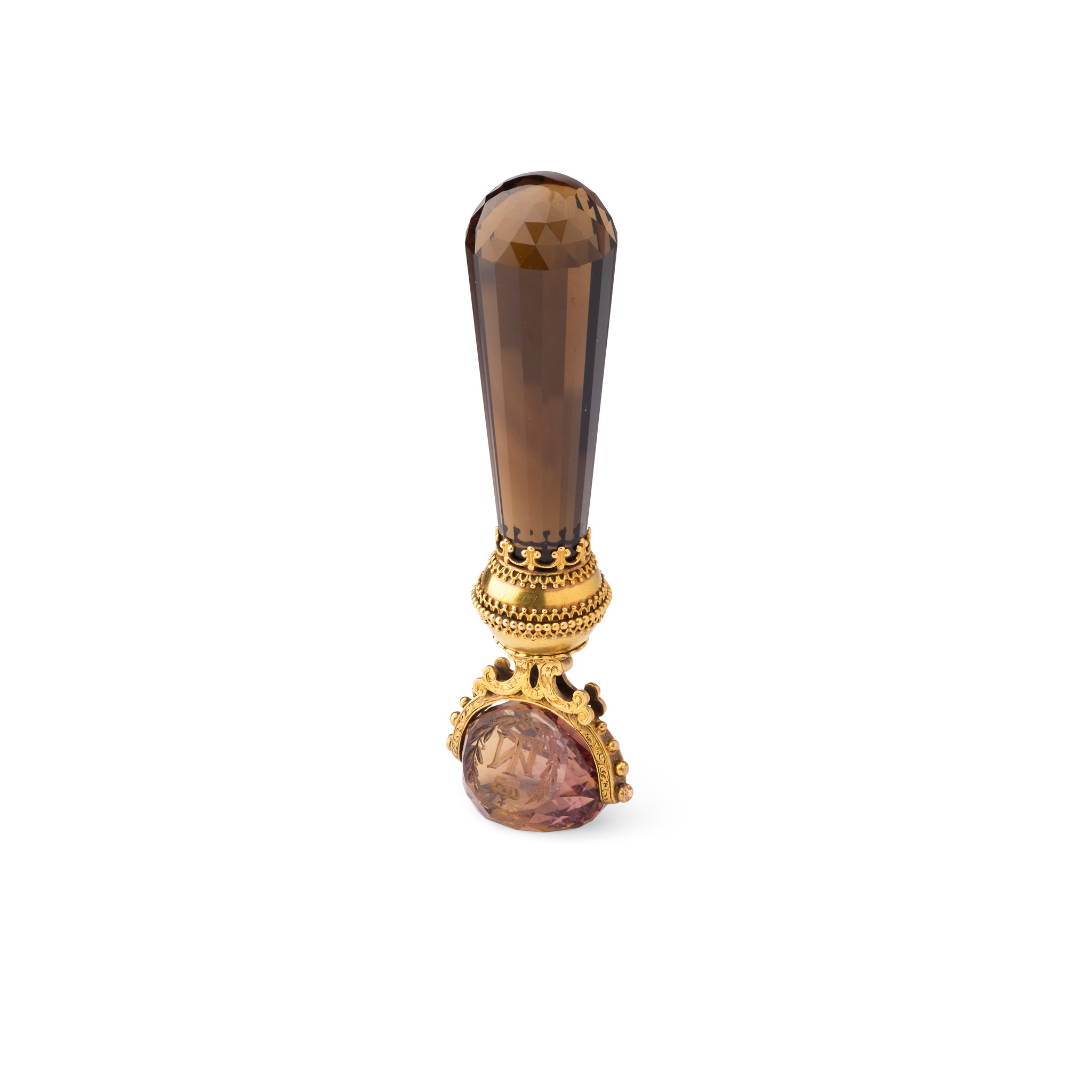The tapered facetted smoky quartz stem to a gold beaded sphere terminal, with fleur-de-lys border, the engraved foliate mount with a three-sided ametrine swivel seal, engraved to one side, 'N 1815'; 'ML' for Marie Louise to another and an engraved depiction of Napoleon as King and Emperor to the third