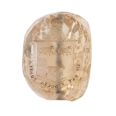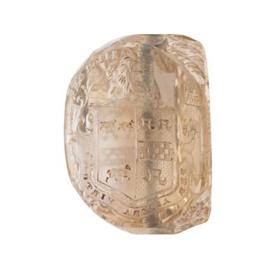 The open scrolling mount with integral suspension ring and reeded shoulders, enclosing a three sided smoky quartz swivel seal, each side bearing a full coat of arms