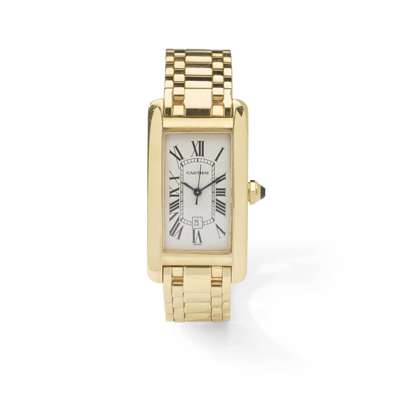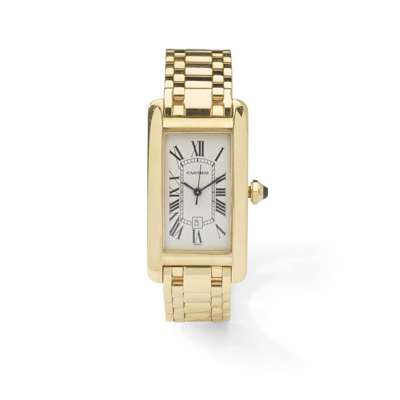 Tank Americaine model 1725, originally purchased 1995 from papers, 18ct gold case, automatic movement, rectangular dial with Roman numerals in black, date aperture at 6, inner railroad seconds track in black, blued steel hand, centre seconds hand, caseback with model and serial numbers, on a bracelet strap with signed concealed 18ct gold clasp, European Convention mark, in box, with swing tag, papers and booklets