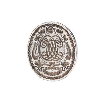 The facetted aquamarine handle, mounted in silver with an oval matrix, with engraved cypher in a scroll border