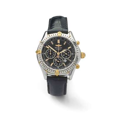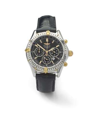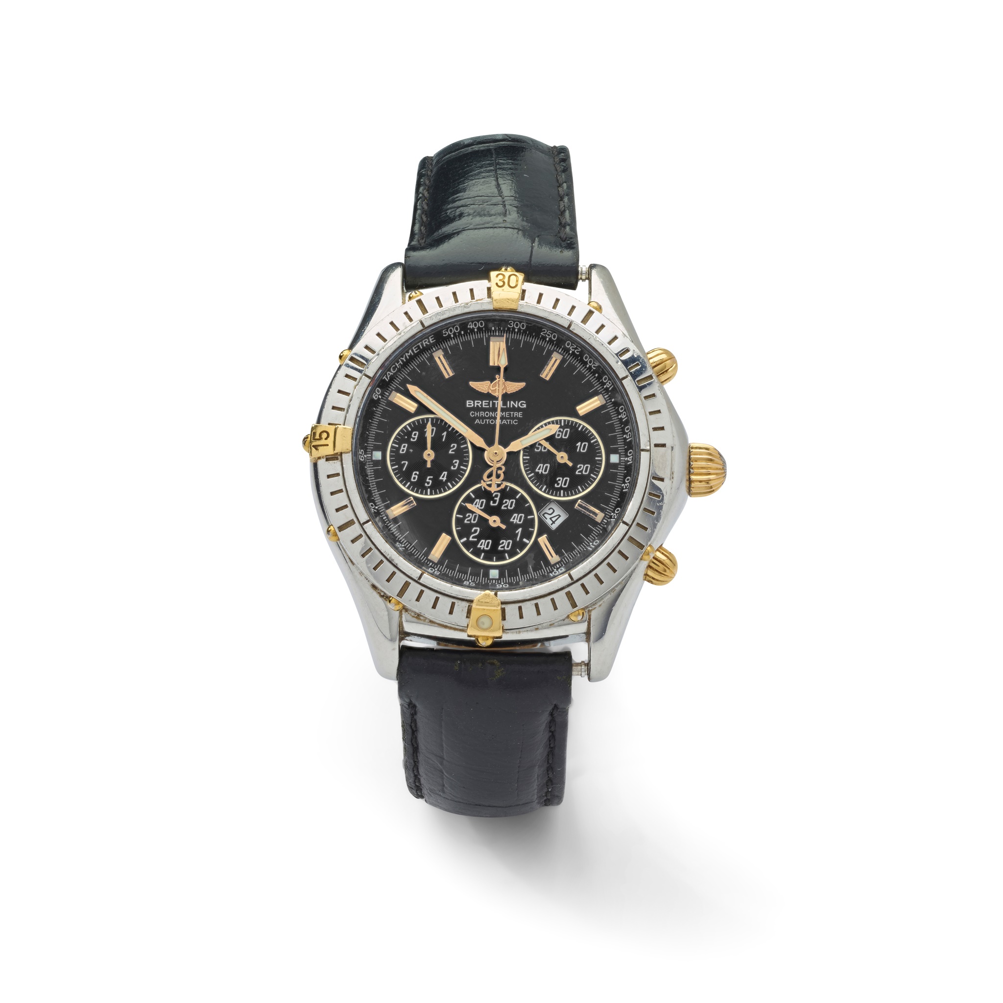 Chronometre Automatic model B35312, stainless steel case, automatic movement, round black dial with applied gold baton hour markers, subsidiary dials at 3, 6, and 9, gold pencil hands with lume inserts, centre seconds hand with Skeleton B logo terminal, tachymetre scale to rehaut, stainless steel bezel with count-up scale and gold accents, gold onion crown, caseback with model and serial numbers, on a black leather strap with a Breitling signed stainless steel deployant clasp, no box and papers