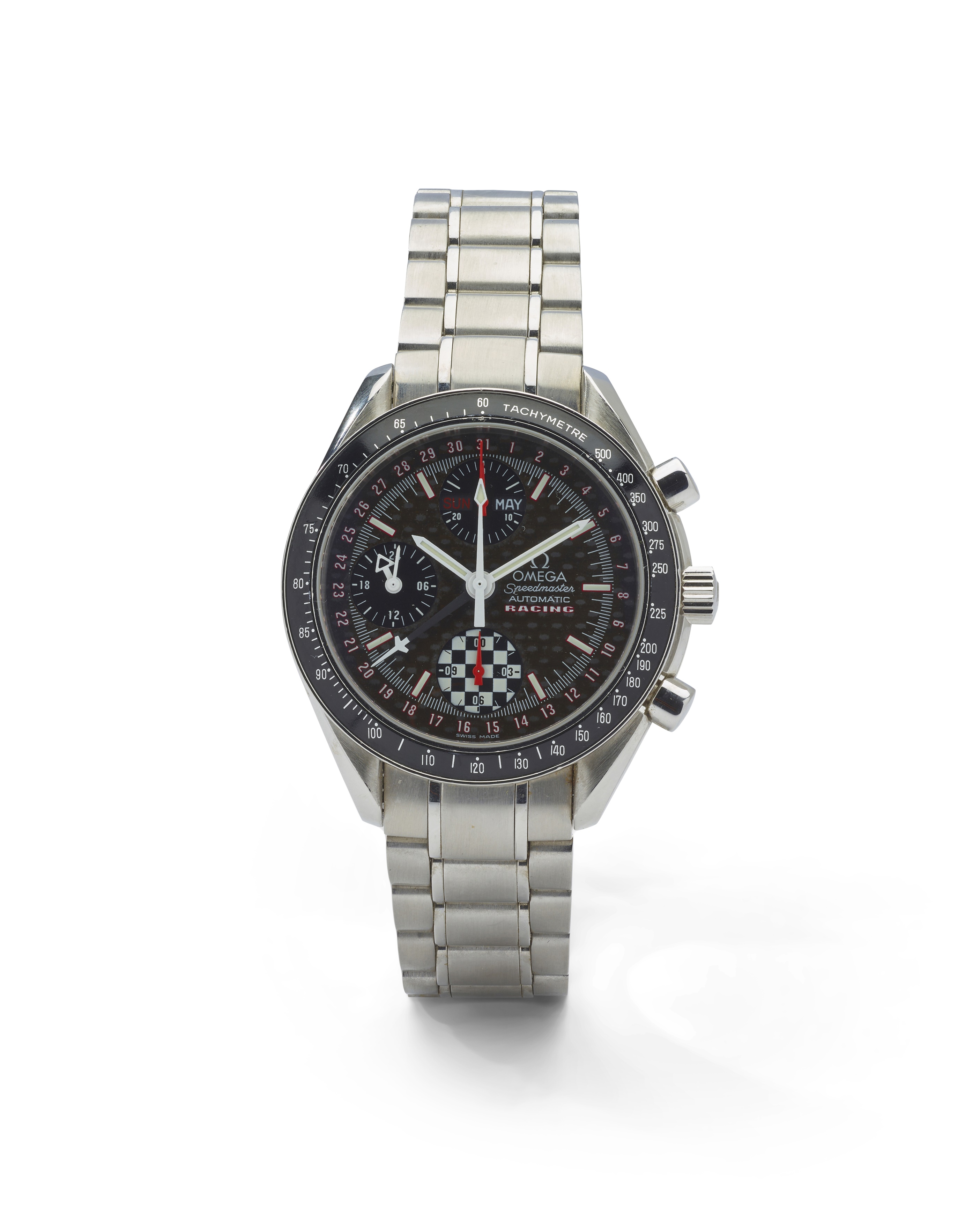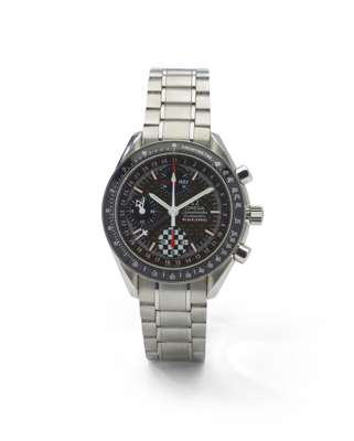 Speedmaster Automatic Racing limited edition Schumacher World Champion 2002, numbered 2741/5555, c.2002, stainless steel case, automatic movement, round black dial with baton hour markers in white, three sunken subsidiary dials at 12, 6 and 9 for 30 minute register, 12 hour register and 24 hour time respectively, day and date apertures within 30 minute register, outer date scale in white, white lume-filled pencil hands, centre chronograph hand, central red date pointer hand, black ceramic bezel with tachymeter scale, crown with Omega logo flanked by two cylindrical push-buttons, caseback with edition number, on a stainless steel bracelet strap with 850 to the end links, Omega signed deployant clasp, in box, lacking guarantee card