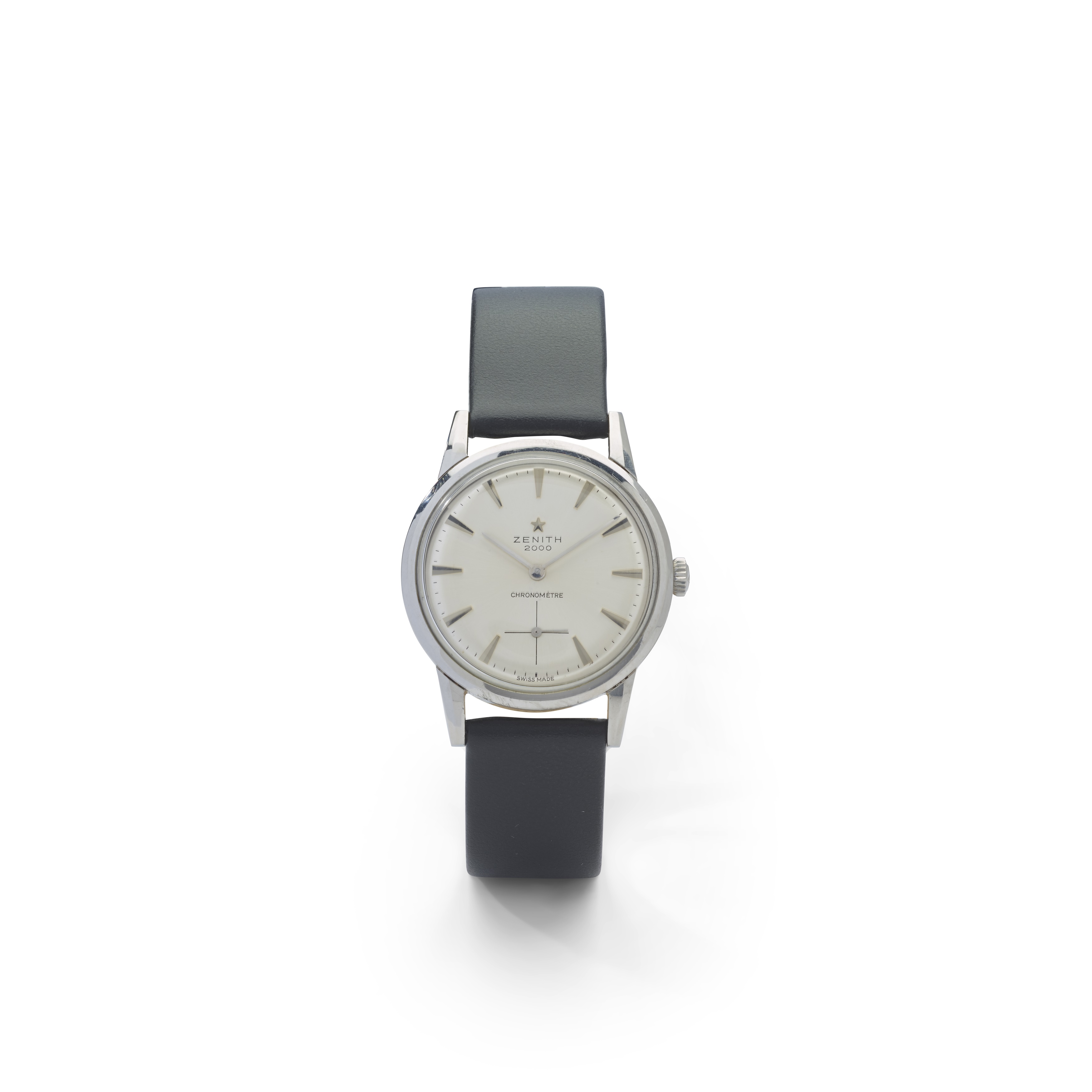 2000 Chronometre model, stainless steel case, Zenith signed manual wind movement, round silver-coloured dial with applied bevelled wedge hour markers, small seconds at 6, outer minutes track in black, pencil hands, crown with Zenith star logo, on a generic strap, no box and papers, serviced 2023