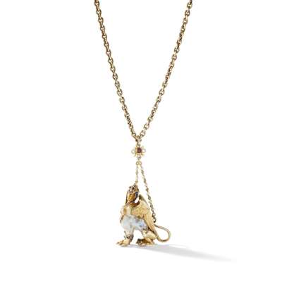 Modelled as a sphinx, the body formed of a baroque pearl, the mount with enamel detail, suspended from a seed pearl chain ,with a garnet and white enamel connector, to an associated silver-gilt belcher-link chain, indistinct marks, pearls untested