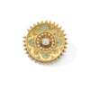 The circular plaque with beadwork border, decorated with filigree motifs and accented with turquoise and white enamel, centring on an old brilliant-cut diamond, maker's mark C.G