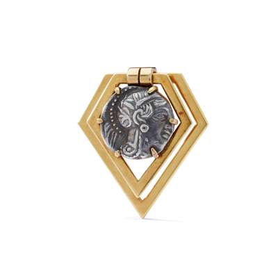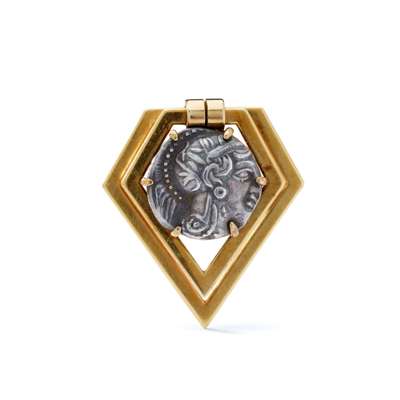 Claw-set with a Roman coin in an angular mount, stamped 750 Bulgari