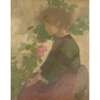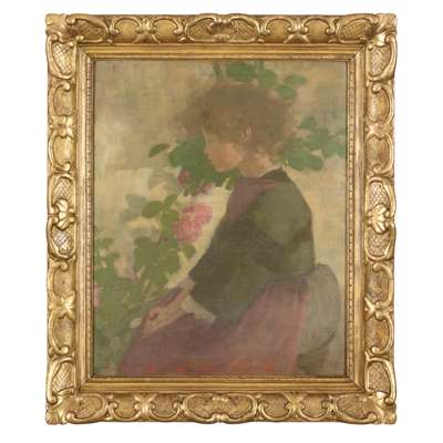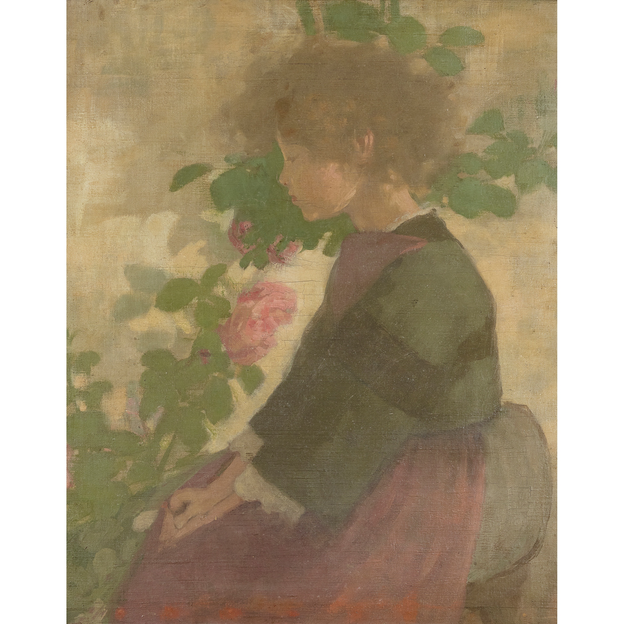 Her subjects were frequently female sitters, often clothed in regional traditional dress. The work offered here is typical of this subject matter, showing a Breton girl in profile. Likely dating from the earlier years of her career, around the late 1890s, her brushwork belies her Glasgow-by-way-of-Paris art education, but is notable for a distinctive softness and her facility to infer the texture of cloth and hair with subtle and minimalistic brushwork. Her works have a gentle, airy quality - evocative of a pensive romanticism. The Breton Girl also features the clever decorative device of a climbing rose incising diagonally across the composition, framing the sitter’s head.
