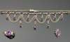 the fringed front collet set with graduated circular cabochon cut amethysts, an 18ct gold ring claw set to the centre with a circular cut amethyst flanked to either side by clusters of rose cut diamonds, together with a heart cut amethyst pendant (3)