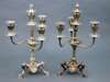 each raised on three paw feet, with shell cast triform base beneath knopped columns, three reeded scroll branches and spiral fluted vase shaped capitals, with reeded and stiff leaf borders throughout