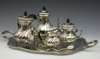 comprising teapot, coffee pot, twin-handled sugar bowl with cover, cream jug and large twin-handled tray, the service of spiral fluted baluster form raised on four leaf capped scroll feet, the shaped oval tray with reeded edge, with matching spoon with shell-shaped bowl (6)