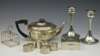 with marks for Birmingham 1912, maker S Blanckensee & Son, each of circular outline on flared foot, a teapot, Sheffield 1933, by Walker & Hall, of faceted circular form, a cedar lined cigarette box, a five-bar toastrack and four assorted napkin rings, various dates and makers (qty)