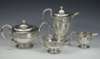 with marks for Glasgow 1917, maker George Edward & Son, comprising teapot, hot water pot, twin-handled sugar bowl and milk jug, each of circular outline on pedestal foot, with cast borders incorporating Celtic knot-work and beasts, the teapot and hot water pot with mythical beast cast spouts, initialled