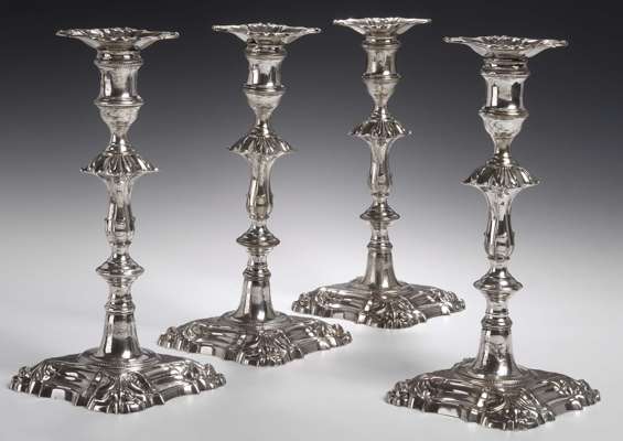 with marks for London 1765, maker Ebenezer Coker, each with shaped square base with shell cast corners and gadrooned borders, beneath knopped columns and waisted cylindrical capitals, with matched sockets and traces of erased crests