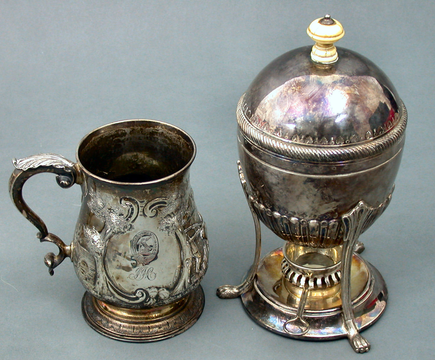with marks for London 1730, maker Francis Spilsbury I, later decorated with a ploughing scene, crested and initialled, together with a Victorian Scottish egg coddler, Edinburgh 1893, maker Brook & Son, of semi-fluted and reeded ovoid form, with gadrooned border to the domed hinged cover and ivory finial, raised on three reeded supports terminating in paw feet