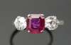 the central corner claw set square trap cut ruby flanked to either side by a round brilliant cut diamond