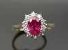 the central claw set oval cut ruby within a surround of round brilliant cut diamonds