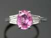 the central claw set oval cut pink sapphire flanked to either side by two tapered baguette cut diamonds, mount stamped 750