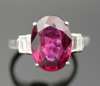 the central claw set oval cut pink tourmaline flanked to either side by two graduated baguette cut diamonds, mount stamped 750