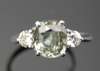 the central claw set cushion cut pale green sapphire flanked to either side by a round brilliant cut diamond, mount stamped 750