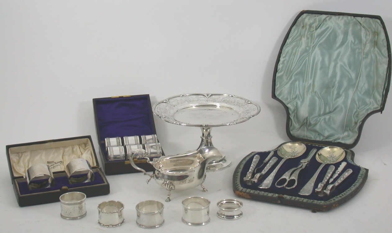 with marks for London 1904, maker Robert and William Sorley, of shaped circular outline on pedestal foot, with foliate scroll pierced border; a Georgian style sauce boat, London 1927; a cased pair of planished napkin rings, Sheffield 1927; five assorted napkin rings; a cased set of six electroplated napkin rings and an electroplated cased set of flatware (10)