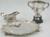 with marks for Sheffield 1907, maker Martin & Hall, of shaped circular outline with foliate, shell and C-scroll cast edge and pie-crust moulded border, raised on three foliate scroll cast feet; a Georgian style sauceboat, Birmingham 1930; together with a twin-handled trophy cup, Sheffield 1908, raised on an ebonised plinth base applied with a plaque inscribed SHILLONG POLO TOURNAMENT, MAY 1909 (3)