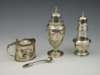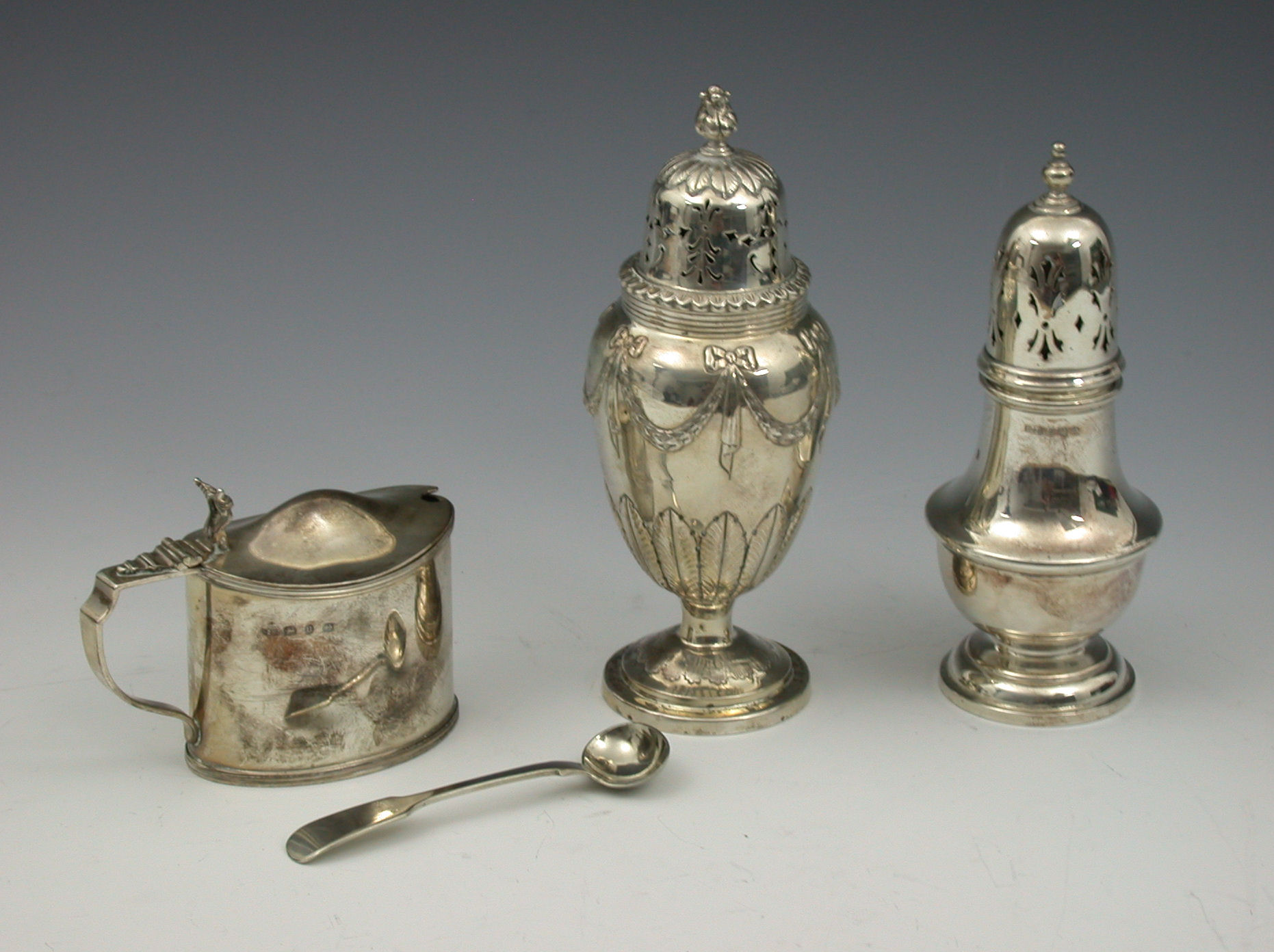 with marks for Chester 1907, maker George Nathan and Ridley Hayes, of ovoid form on pedestal foot cast in the Adam style; another caster, Birmingham 1934 and an oval lidded mustard, Birmingham 1894, with a plated spoon (4)