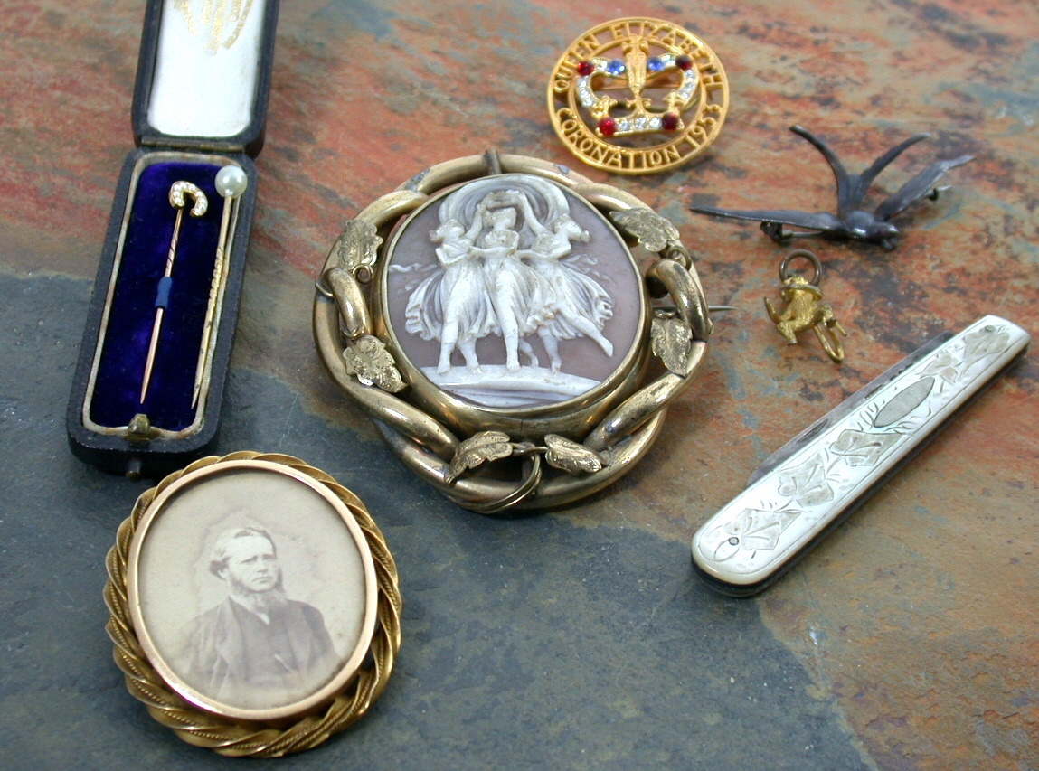 to include assorted fobs; a large oval shell cameo brooch; memorial pieces; stickpins; simulated pearl necklaces; assorted coins; medals and other pieces (qty)