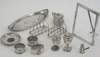 with marks for London 1784, maker Robert Hennell I, of navette form with beaded edge, bright engraved and pierced borders; a Victorian lidded mustard pot; two bun top peppers; a novelty miniature chocolate pot form pepper; two toastracks; a coin inset dish; a photograph frame and three napkin rings, various dates and makers (12)