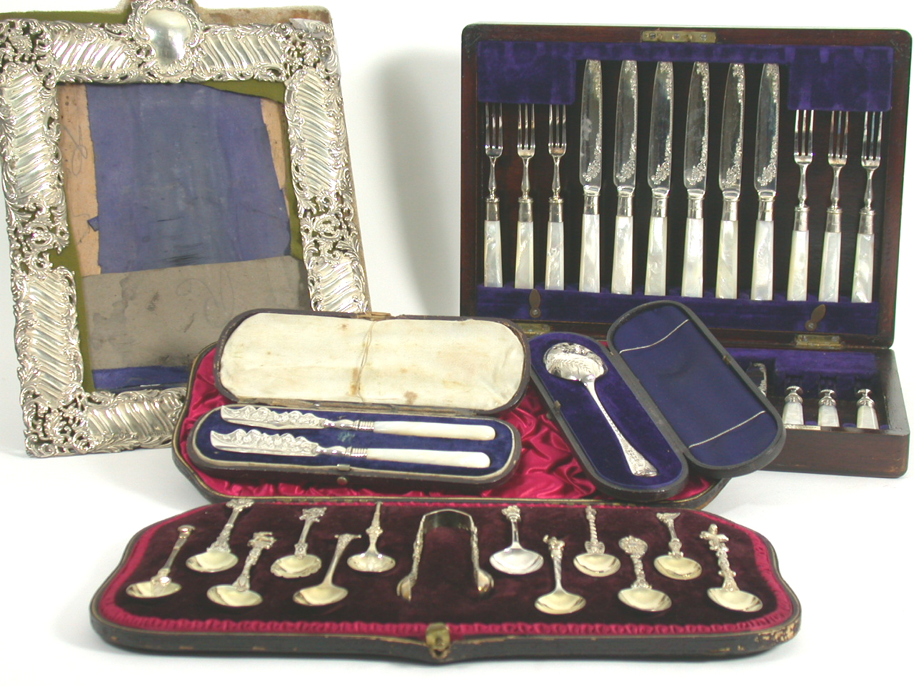 with marks for London 1900, maker Goldsmiths & Silversmiths Co. Ltd, of rectangular outline decorated with foliate scrolls (A/F); a matched cased set of twelve decorative coffee spoons with tongs; a cased preserve spoon; a cased pair of mother of pearl handled butter knives and a cased set of twelve pairs of electroplated tea knives and forks with mother of pearl handles (5)