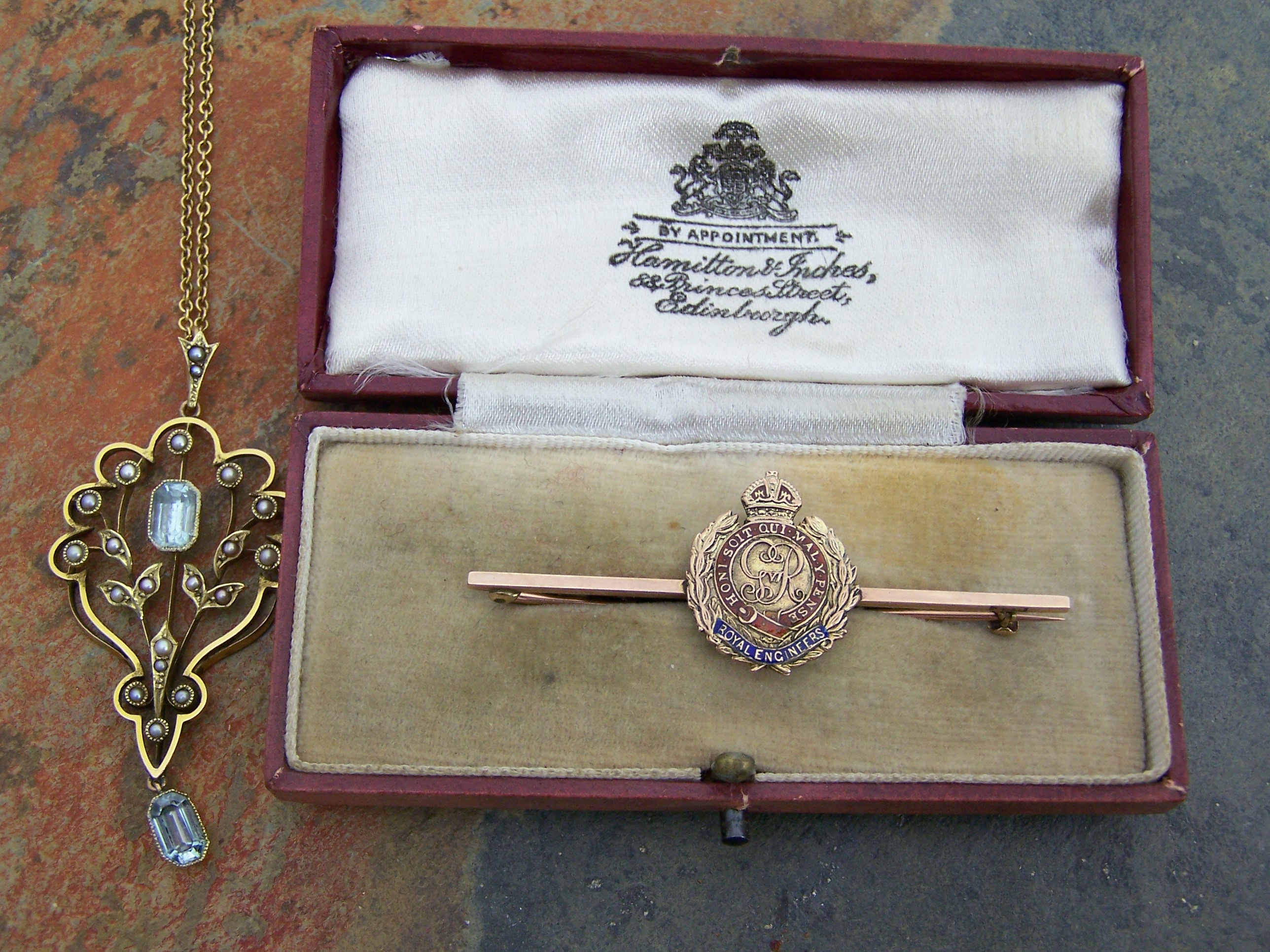 of open scroll design, millegrain collet set throughout with seed pearls, with central trap cut aquamarine and similar drop, suspended from a fine belcher link chain; together with a 9ct gold enamel decorated Royal Engineers bar brooch, contained in a fitted case (2)