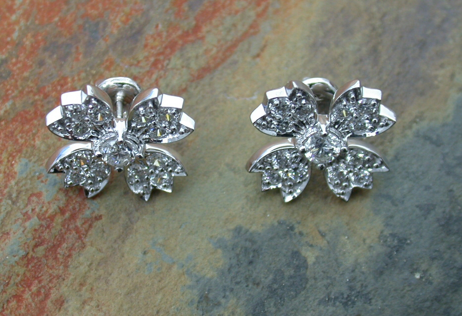 each designed as a four-petalled flowerhead, set to the centre with a round brilliant cut diamond, with similarly cut diamond set petals