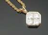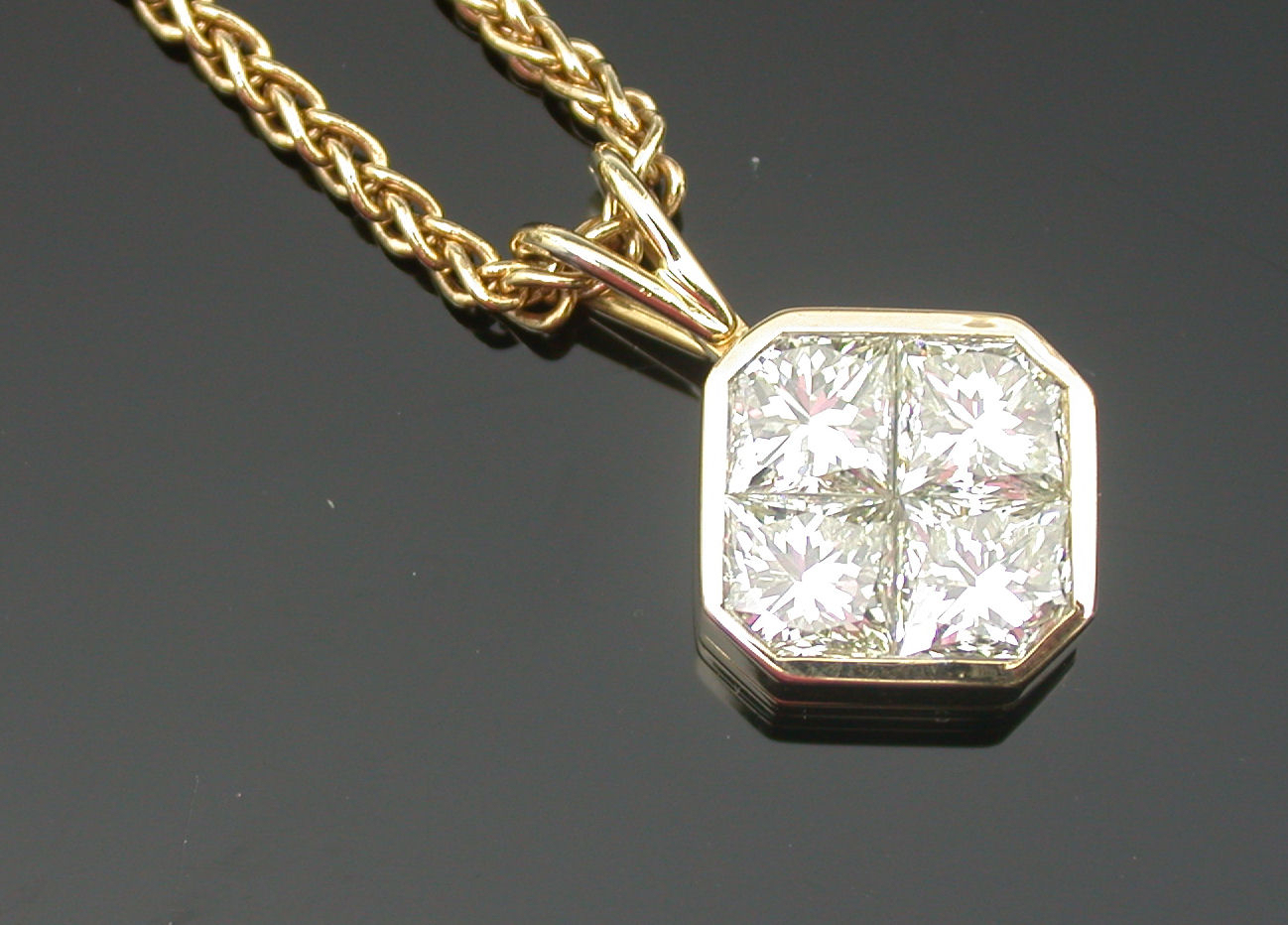 of canted square design, invisibly set with four fancy cut diamonds, mount stamped 750, suspended from an 18ct gold fancy link chain