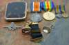 a citrine set fob suspended from a 15ct gold mounted black moire ribbon; a citrine set swivel fob; a 9ct gold mounted tortoiseshell cigarette case; together with WWI, BWM, AVM, SURG. S. LT. R. L. STEWART. R.N.V.R and miniatures (qty)