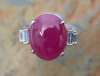 the central claw set oval cabochon cut ruby, flanked to either shoulder by two graduated baguette cut diamonds, mount stamped 750