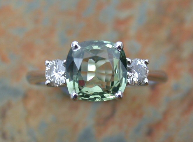 the central cushion cut pale green sapphire flanked to either side by a round brilliant cut diamond, mount stamped 750