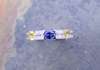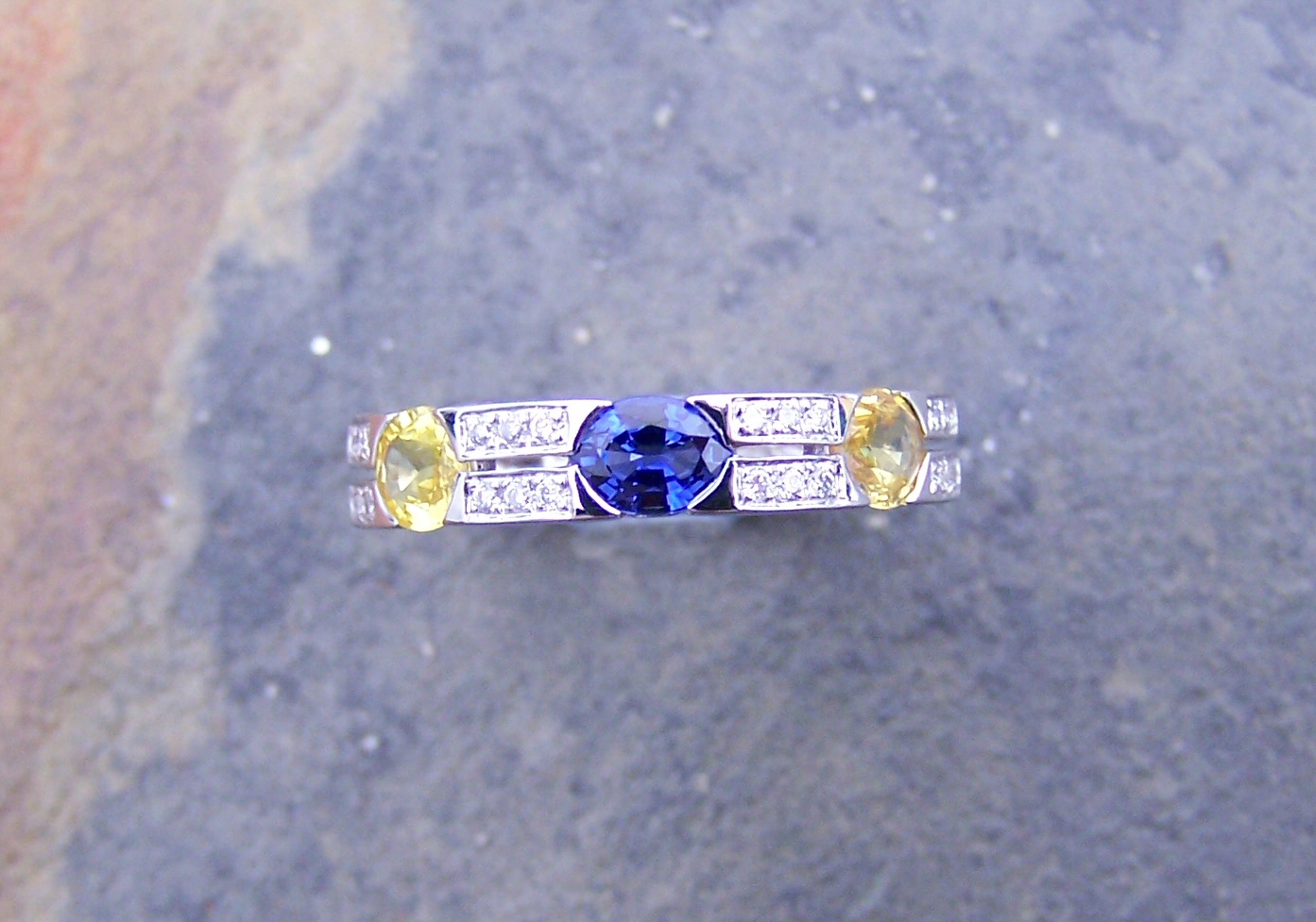 set to the front with two rows of round brilliant cut diamonds with central oval cut bright blue sapphire flanked to either side by a similarly cut yellow sapphire
